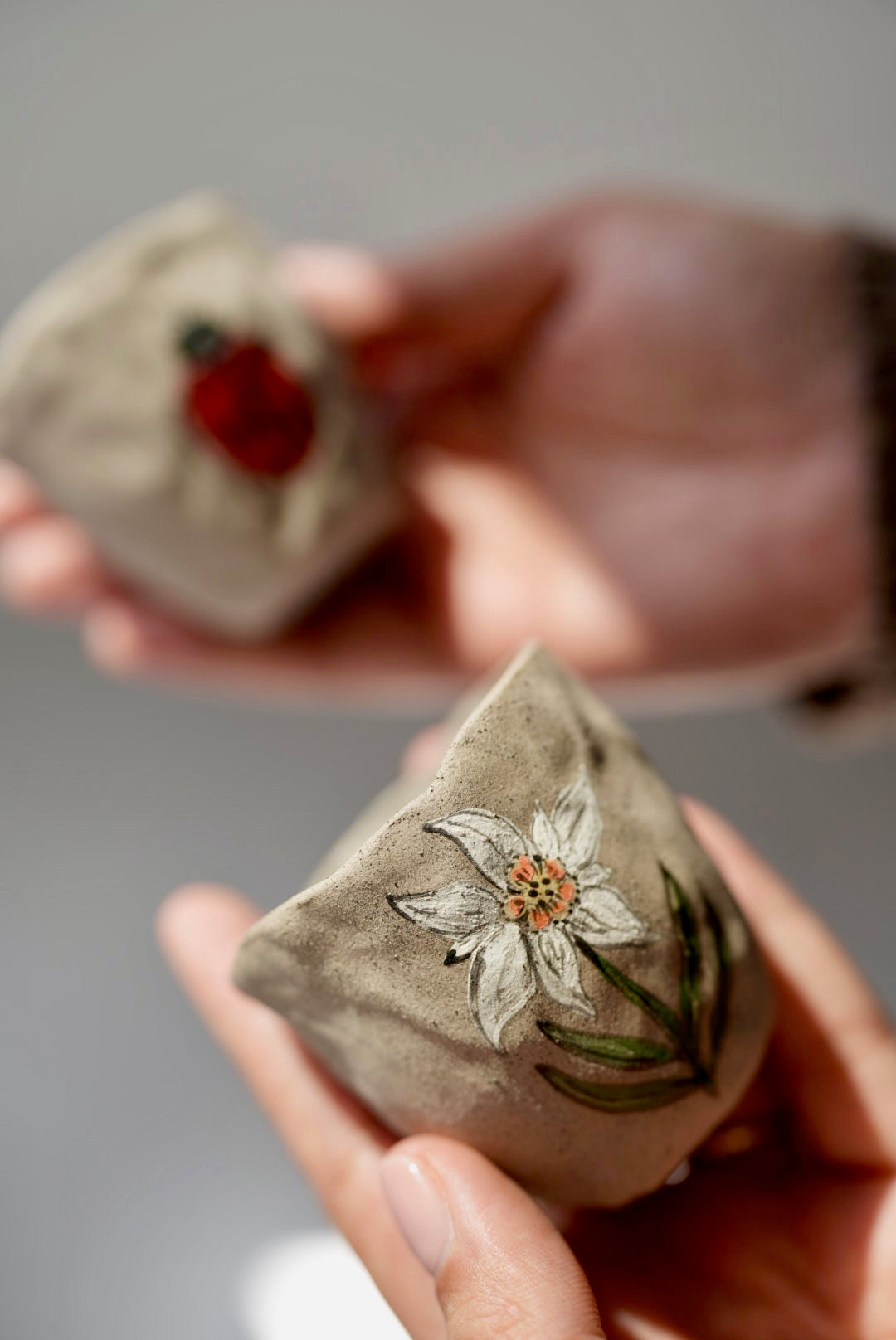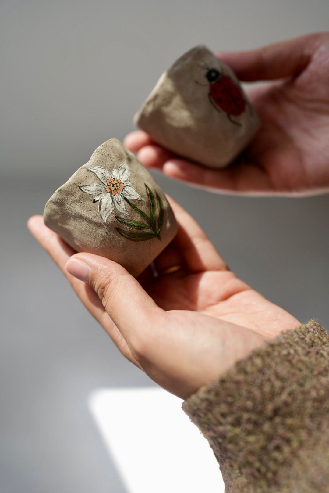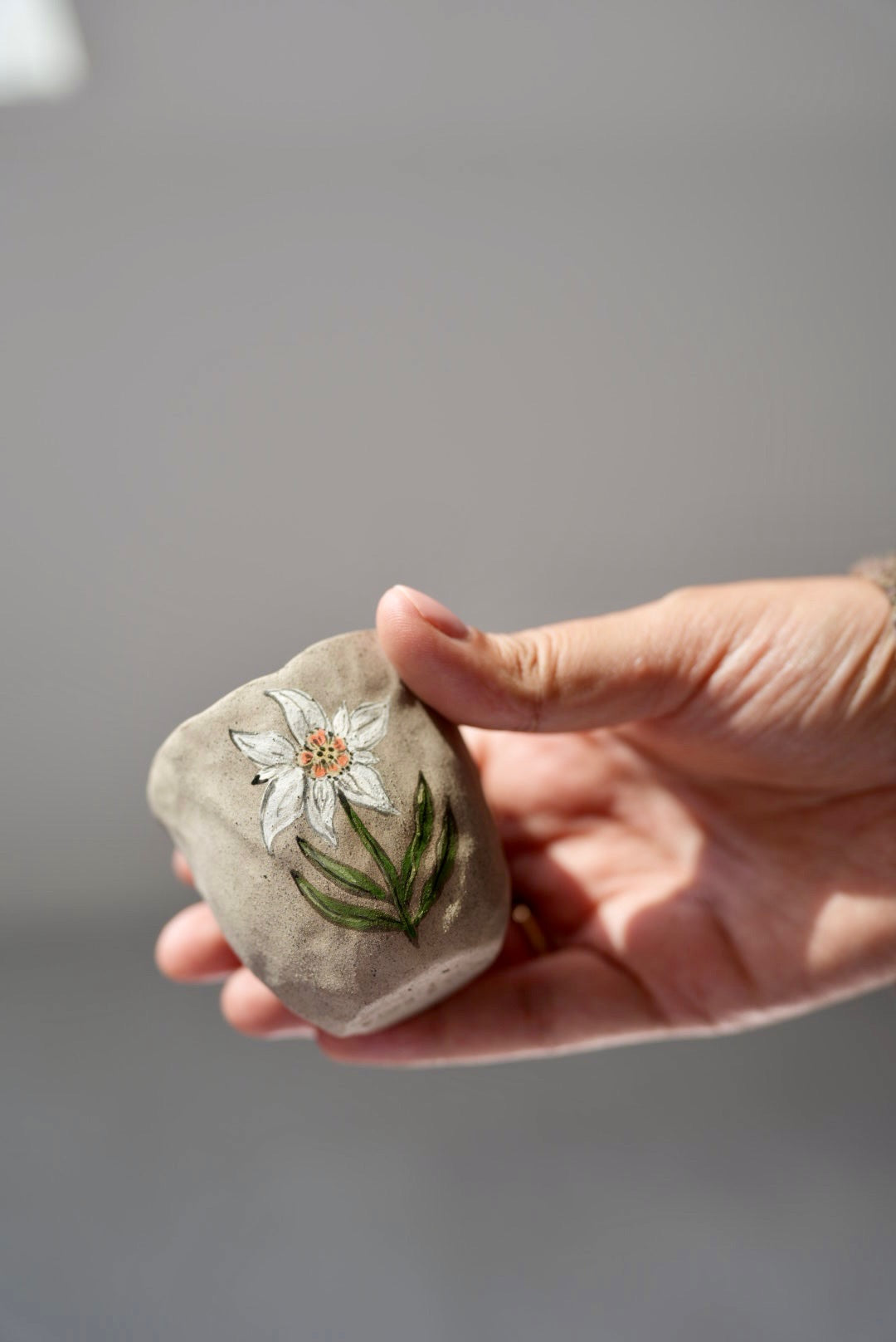 Diese handgefertigte Keramiktasse überzeugt durch ihre unperfekte, natürliche Form. Als liebevolles Detail schmückt eine handgemalte Edelweiss-Blume die Vorderseite – ein Symbol für Heimat und Naturverbundenheit.